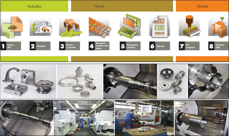 Na trhu není a v nejbližší době ani nebude univerzální CAD, CAM ani CAD/CAM řešení, které by dokázalo stoprocentně splnit veškeré požadavky zákazníků na tento software (horní obrázek popisuje výrobní cyklus od nabídky k postupovému lisovacímu nástroji, který je rozdílný v porovnání s typem produkční CNC výroby na spodních obrázcích). |