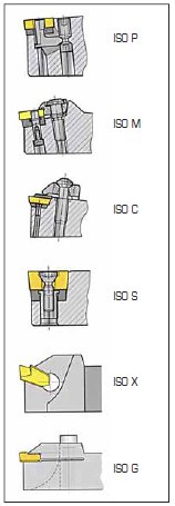 Způsob upnutí řezné destičky (VBD) koresponduje s jejím typem (obr. 2) a je dle ISO označen písmenem obsaženým i v kódovém označení nože. Upínání typu ISO P pomocí vnitřní páky je určeno pro negativní VBD k vnějšímu hrubování a dokončování, resp. k obrábění větších vnitřních průměrů. Typ ISO M s čepem a vnější upínkou je vhodný tam, kde se předpokládá zvýšené dynamické namáhání, a to převážně u vnějšího soustružení. Typem ISO C s upínkou se upínají negativní i pozitivní VBD; pod upínku lze vložit ještě příložný utvářeč. Upínání typu ISO S je určeno především pro menší průřezy nožového držáku, pro vnější i vnitřní soustružení. VBD je v lůžku fixována speciálním šroubem, který dosedá do kuželového zahloubení v jejím otvoru. Důležité je jeho přesné dotažení předepsaným krouticím momentem. Tam, kde je omezený prostor do strany – např. při upichování nebo tvarovém soustružení – se užívají typy upnutí ISO X (upnutí do samosvorného lůžka) nebo ISO G (dotlačování VBD upínkou shora). V obou těchto případech je nutná stranová fixace VBD, která je realizována většinou profilem na spodní straně VBD, jež zapadá do příslušného tvaru dosedací plochy lůžka držáku. Za povšimnutí stojí použití podložky pod VBD znázorněné na obrázku. Podložka je zhotovena ze slinutého karbidu, zajišťuje přesné dosednutí VBD do lůžka a chrání vlastní lůžko v nástrojovém držáku před omačkáním a poškozením v případě havárie řezné destičky. Pro zvýšení stability a opakovatelnosti polohy upnutí se dodávají i pro obecné a tvarové soustružení VBD s tvarovými výstupky na spodku destičky, zapadajícími do vybrání v lůžku – např. systém CoroTurn iLock se dvěma na sebe kolmými průběžnými drážkami.