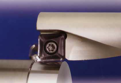 UPÍNÁNÍ SOUSTRUŽNICKÝCH NÁSTROJŮ, TYPY DRŽÁKŮ Je dáno především typem držáku a typem prováděné operace. Klasický prizmatický držák pro vnější soustružení (obr. 3) se upíná do suportu nebo revolverové hlavy; není určen pro automatickou výměnu. Obdobné držáky se používají u soustružnických automatů nebo jako nástroje, upínané do kazet či nástroje pro obrábění miniaturních součástí. Konstrukce držáků pro vnitřní soustružení, resp. vyvrtávacích tyčí, je zásadně ovlivněna malým prostorem pro montáž VBD a tím, že nástroj musí pracovat s velkým vyložením. Obecně platí: max. vyložení L x D = 3 - 4 pro ocelové držáky, L x D = 6 pro tvrdokovové tyče, L x D = 7 pro ocelové držáky s tlumením a L x D = 10 – 14 pro karbidem vyztužené tlumené vyvrtávací tyče. Ke snížení vibrací a zlepšení opracovaného povrchu přispívají všechna opatření, která snižují radiální složku řezné síly – tj. malý průměr špičky VBD, úhel nastavení hlavního břitu 90°, pozitivní geometrie a malý rádius břitu. Upichovací nástroje musí být velmi ploché, aby se minimalizoval odpad materiálu při upichování, a proto mají většinou tvar planžety. Utvářeč třísky upichovací VBD musí zajistit její sbalení tak, aby tříska byla menší než šířka upichování – v opačném případě hrozí poškození obrobených čel odcházející třískou. Soustružnické nástroje pro automatickou výměnu ve vřetenu se používají ve víceprofesních obráběcích centrech, kde jsou umístěny v zásobníku nástrojů a po upnutí do vřetena musí být zaručen nejen dostatečný přenos krouticího momentu od řezných sil – špička nástroje je mimo osu vřetena – ale i definovaná poloha špičky nástroje. V praxi to znamená, že stroj musí být schopen zastavit vřeteno v přesně definované poloze kolem osy otáčení a nástroj se musí upnout do vřetene do přesné úhlové polohy vzhledem k jeho ose; další podmínkou je dostatečná tuhost upnutí. Upínací rozhraní pro nerotační aplikace, splňující tyto podmínky, jsou především Coromant Capto (Sandvik) a CamFix (Iscar) na principu neokrouhlé stopky a HSK-T, což je upínač HSK upravený pro polohově přesné upnutí nerotačních nástrojů. MODULÁRNÍ NÁSTROJE Spolehlivé upínací rozhraní vytváří předpoklad pro vytvoření stavebnicového souboru nástrojů, které mají společný upínací prvek do vřetena stroje, na nějž navazuje několik typů držáků, resp. redukcí, které slouží jako nosiče vlastní pracovní hlavice. Výsledná sestava musí být dostatečně tuhá a je žádoucí, aby dovolila přívod řezné kapaliny k břitu nástroje vnitřkem nástroje. V rámci jednoho velikostního souboru tak lze sestavit řadu typů nástrojů, vhodných pro zamýšlenou specifickou úlohu. Podmínkou docílení nákladové výhodnosti užití modulárních nástrojů je pečlivý ekonomický rozbor, zahrnující jak typy a opakovatelnost prováděných operací, tak rozsah pořizovaného souboru a cenu jeho prvků. MULTIFUNKČNÍ NÁSTROJE