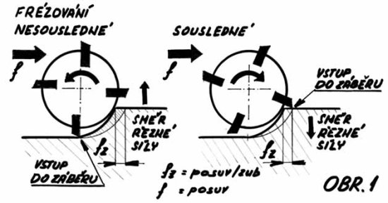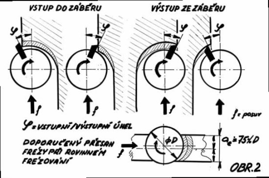 Úvodem nutno zdůraznit: fréza rotuje vysokými otáčkami; je proto nezbytné mít na zřeteli nejvyšší povolené otáčky nástroje, dbát na správné upnutí výměnné destičky a neporušenost všech upínacích elementů! Uvolněná břitová destička má razanci kulky z pistole! REŽIMY FRÉZOVÁNÍ, VLIV POLOHY OSY FRÉZY NA TVAR TŘÍSKY A NAMÁHÁNÍ BŘITU Frézování klade vysoké nároky na břit nástroje; břit je namáhán rázovým zatížením, měnícími se řeznými silami a tepelnými šoky při vnikání do materiálu a při vyjíždění ze záběru. Nestejnou roztečí břitů lze snížit nebezpečí vzniku vibrací při práci za nestabilních podmínek. Během záběru se mění tloušťka třísky, může docházet k místnímu zpevnění obráběného materiálu, se změnou polohy osy nástroje vůči obráběnému povrchu se mění úhel vstupu i úhel výstupu břitu ? a průběh změny tloušťky třísky. Zásadní vliv má, zda se pracuje v režimu sousledného či nesousledného frézování (obr. 1). Při nesousledném režimu, kdy je směr posuvu frézy opačný, než je jeho směr rotace, vniká břit do materiálu v místě nulové tloušťky třísky; dochází ke zpevnění materiálu a velkým radiálním silám; při výstupu břitu z nástroje vznikají velká tahová napětí, hrozící poškodit břit a řezné síly mají tendenci zdvíhat obrobek ze stolu. Hrozí vtažení třísky do řezné zóny a poškození povrchu obrobku. Proto je třeba dávat vždy přednost práci v režimu sousledného frézování, pokud tomu nebrání jiné skutečnosti – např. citlivost keramických VBD na ráz při vstupu do materiálu nebo extrémně velké rozdíly přídavků na obrábění. Poloha osy nástroje vůči obrobku ovlivňuje úhel ? vstupu a výstupu břitu do záběru (obr. 2). Vstupní úhel v rozsahu +30° až +90° nebo -30° až -90° umožňuje užití vysokých řezných rychlostí a plynulý vstup do záběru; vstupní (i výstupní) úhel okolo 0° znamená nevýhodné namáhání břitu - je třeba se mu vyhnout; výstupní úhel by se měl proto pohybovat v rozmezí +30° až +90° nebo -30° až -90°, přičemž je nutno dávat přednost tomu, aby tloušťka třísky na výstupu nebyla příliš velká (nevýhodné namáhání břitu nástroje). Proto se při čelním frézování volí průměr frézy o 20 – 50 % větší než šířka záběru a osa frézy se posunuje mimo střed obrobku. Při programování dráhy nástroje je nutno dbát na to, aby náhlou změnou směru nedocházelo k rázům či nevýhodné tloušťce třísky na vstupu i výstupu, podobně jako při vstupu do řezu na přímé dráze; fréza musí zůstat stále v záběru. KVALITA OPRACOVANÉHO POVRCHU je dána několika aspekty obráběcího procesu. Řeznými parametry (posuv na otáčku nesmí překročit 80 % šířky hladicího břitu), provedením špičky řezné destičky (větší či menší poloměr, provedení s hladicím břitem) a konstrukcí vlastního tělesa frézy, které např. u čelních fréz pro náročné operace musí zajistit u všech břitů minimální axiální házivost, aby nedocházelo k poškození opracovaného povrchu vyčnívající destičkou, je-li tato v protilehlé poloze vzhledem k poloze, kdy obrábí. Nežádoucí stopy na obráběném povrchu zanechávají nežádoucí vibrace celé soustavy a konečně, při práci obvodem frézy vzniká nerovná struktura povrchu, vytvářená radiálním záběrem. Velikost nerovností této struktury je přímo úměrná druhé mocnině posuvu na zub a nepřímo úměrná průměru použité frézy. ÚHEL NASTAVENÍ je úhlem mezi hlavním ostřím břitové destičky a povrchem obrobku. Nejčastěji užívanými hodnotami jsou 90° u válcových fréz do rohu nebo u obrábění tenkostěnných obrobků, kde se musí eliminovat axiální zatížení řeznými silami; dále 45° jako hlavní volba pro čelní frézování, dávající vyvážené axiální a radiální řezné síly a užívaná všude tam, kde záleží na plynulém zahájení řezu a malých tendencích k vibracím. Pro zanořovací frézování a velmi vysokých posuvech na zub je vhodný úhel nastavení 10°, kde řezná síla převážně axiálního směru je vhodná pro vysoké vyložení štíhlých nástrojových sestav při práci v dutině obrobku. Proměnným úhlem nastavení podél břitu se vyznačují kruhové břitové destičky, využívající vysokou pevnost břitu; je nutno počítat s měnícím se směrem řezné síly dle toho, jak se mění hloubka řezu. UŽITÍ ŘEZNÉ KAPALINY
