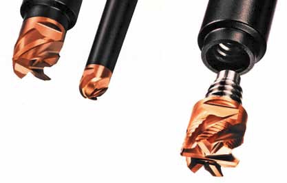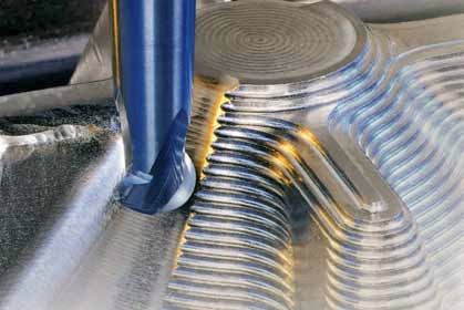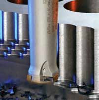 Vzhledem k měnícímu se sklonu opracované plochy se používají frézy s kruhovými řeznými destičkami nebo stopkové frézy s kulovým čelem, jejichž další výhodou je menší množství neodebraného materiálu na rozhraní jednotlivých vrstev. Vhodnou volbou metody a nástroje se sníží nebo dokonce vyloučí potřeba časově náročného ručního doleštění. Při vytváření dutiny je důležité volit řezné podmínky tak, aby se minimalizovala hloubka řezu a dosáhla se konstantní velikost přídavku, aby u každého nástroje docházelo pouze k malým změnám pracovního zatížení nebo směru pohybu. Vytváří-li se dutina konturovacím frézováním (obr. 3) – tzn. po vrstevnici, odebíráním materiálu vrstvu po vrstvě, lze snáze kontrolovat řeznou rychlost. Lze navíc využít velké rychlosti posuvu či metodu vysokorychlostního obrábění, dosahuje se vysoké produktivity, spolehlivosti a dlouhé životnosti řezného nástroje. Při vytváření dutiny v celistvém povrchu obrobku se do záběru dostává střed nástroje s nulovou řeznou rychlostí; odpomocí je volba vhodného nástroje nebo sklonění jeho osy o 10°- 15°. Při kopírovacím frézování dráha nástroje představuje kombinaci vzestupného a sestupného frézování s řadou nájezdů a výjezdů ze záběru. Vzniká riziko vylamování břitu při přiblížení se nástroje ke dnu dutiny, kolísá jeho zatížení i řezné podmínky (hloubka řezu i efektivní řezná rychlost), při přiblížení nástroje ke stěně se výrazně zvyšuje styčná délka břitu a obrobku a roste nebezpečí vzniku vibrací a průhybu nástroje. Dynamické vlivy (rázy, změna zatížení nástroje měnící jeho průhyb) mohou způsobovat chyby v dosažené geometrii opracované plochy. Pro práci s velkým vyložením se s výhodou používají nástrojové systémy držáků s přesnými výměnnými hlavicemi (obr. 4), např. Sandvik Coromant CoroMill® nebo Iscar Multi- Master. Výměnné hlavice se dodávají v řadě materiálových i tvarových variant; jejich výměnu na držáku lze provést ve velmi krátkém čase přímo na stroji a bez náročného doseřizování. Nebezpečí vzniku vibrací se sníží zmenšením hloubky řezu, řezné rychlosti či posuvu, použitím tuhého a vyváženého nástroje s minimálním radiálním házením a nasazením tlumeného držáku či nástrojového adaptéru. Speciální metody zahrnují řadu postupů přizpůsobených pro daný účel. Pro frézování hran, frézování odlehčení či přípravu pro svařování většinou nejsou zapotřebí velké hloubky řezu či šířky záběru v porovnání s průměrem frézy. Proto lze volit vyšší řeznou rychlost i vyšší posuv na zub. Tvar sražení může být dán tvarem nástroje – např. vhodnou výměnnou hlavicí – nebo využitím sklonění vřetena či obrobku, dovoluje- li to koncepce a řídicí systém stroje. Sražení hrany otvoru lze provádět např. stopkovými frézami Sandvik Coromant CoroMill® 327 a 328 nebo noži CoroTurn® XS s využitím kruhové interpolace, a to i z odvrácené strany otvoru.