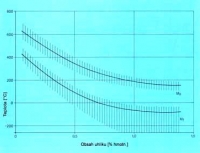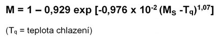 Z obr. 1 rovněž vyplývá, že teplota ukončení tvorby martenzitu může podle přesnosti dnešních zjišťovacích metod dosahovat až pásma teploty asi –200 °C i níže. Vytvářené podíly martenzitu se s klesající teplotou zvyšují a lze je popsat pro oceli vhodné k zušlechťování na základě rovnice: