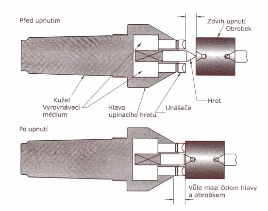 ZVLÁŠTNÍ ZPŮSOBY UPÍNÁNÍ Pro pokrytí nadstandardních požadavků se nabízí řada sofistikovaných konstrukcí sklíčidel. Sklíčidla se zpětným tahem čelistí dotahují obrobek k axiálnímu dorazu, aby byla zajištěna jeho přesná axiální poloha. Ovládání radiálního pohybu čelistí pomocí plovoucího ovládacího prvku způsobuje vyrovnání upínací síly, vyvozované jednotlivými čelistmi při nerovném upínacím povrchu, anebo jej lze využít ke středění upínaného dílce. Pro zamezení poklesu upínací síly při vysokých otáčkách se používají sklíčidla s kompenzací odstředivé síly, k dispozici jsou sklíčidla s upínáním mimo osu rotace dílce (např. pro obrábění klikových hřídelů). Snížení vedlejších časů napomáhají konstrukce rychlé výměny upínacích čelistí a pro upínání osově nesouměrných dílců jsou v nabídce sklíčidla, řešící nevývahu osovým vyrovnáním hmot pomocí přesuvných přídavných závaží. UPÍNÁNÍ MEZI HROTY Pro upínání obrobků na soustruzích, bruskách a měřicích přístrojích se používají upínací hroty, které se při řádně upnutém obrobku, kdy je hrot plně zatlačen do středicího důlku v čele dílce, vyznačují maximální přesností. Tím se rozumí, že osa otáčení obrobku, daná umístěním vhodných, nepoškozených a neznečištěných středicích důlků, je totožná s osou upínacích hrotů. Provedení vlastního hrotu odpovídá tvaru středicího důlku a jeho tvar může být modifikován tak, aby řezný nástroj mohl opracovávat i čelo upnutého dílce. Na trhu jsou i hroty v provedení pro upínání dutých obrobků nebo s prodlouženým provedením pro snazší přístup k čelu obrobku, hroty s odtlačovací maticí pro snazší vyjmutí obrobku a další. Upínací hroty mohou být pevné, vyznačující se vysokou tuhostí, či otočné (obr. 3), které jsou sice šetrné k středicímu důlku v obrobku i k vlastní špičce, avšak vykazují menší axiální i radiální tuhost. Pro přesné seřízení polohy osy otáčení obrobku lze užít i hroty excentricky stavitelné. K nevýhodám tohoto způsobu upnutí patří neschopnost upínacích hrotů přenášet krouticí moment dostatečně velký k vyrovnání tangenciální složky řezné síly. Řešením je buď užití upínacího sklíčidla, opatřeného středicím hrotem, užití separátního unášeče, jako je unášecí srdce apod., nebo nasazení upínacího hrotu s čelními unášeči (obr. 4). Aby se v tomto případě docílilo správného kontaktu všech prvků s čelem obrobku, musí být vlastní hrot odpružen a současně musí být vyřešena možnost nezávislé změny axiální polohy čelních unášečů – odpružením nebo jejich usazením do komory s hydraulickým médiem. Obecně platí, že obráběný průměr by neměl přesahovat dvojnásobek průměru, na němž jsou čelní unášeče rozmístěny. Kvalita upnutí obrobku je dána kvalitou středicího důlku, tuhostí obráběcího stroje a dostatečným axiálním přítlakem, který zajistí plný kontakt hrotu a středicího důlku. Nezbytnou velikost axiálního přítlaku lze zjistit z nomogramů, které poskytují jejich výrobci. Z nutné velikosti axiální síly, která během upnutí na obrobek musí působit, vyplývá i požadavek na to, aby obrobek měl dostatečnou tuhost a nedocházelo k jeho deformaci.