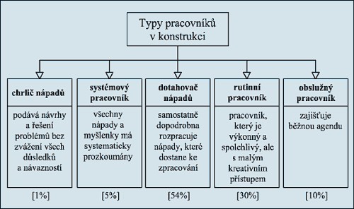 konstrukce, a to jak při průchodu zakázky firmou, tak při vývojových inovacích, a umožnit konstruktérovi např. i efektivní návrhy a výběr optimálních řešení z několika variant, se jeví uplatnění poznatků Engineering Design Science (EDS). EDS je relativně nový vědní obor, rozvíjející se ve světě teprve od čtyřicátých, u nás od šedesátých let minulého století. Po řadě vývojových etap dospěl v posledním desetiletí vývoj poznatků EDS do kvalitativně nové úrovně, kterou lze označit jako podpora znalostmi integrovaného systémového konstruování. Zjednodušeně jej lze přirovnat k hledání konstrukčního řešení na rámcově doporučené „ideální“ cestě v „mapě“ systematicky uspořádaných a provázaných poznatků z teorie i praxe. Cesta k cíli vede „příměji“ (viz obr. 2). Z uvedeného vyplývá, že intuitivní a systematické konstruování se mohou velmi dobře doplňovat, z hlediska náročnosti však patří mezi nejobtížnější přístupy (viz obr. 3). Tento systematický přístup však v praxi naráží na bariéry lidských vlastností konstruktérů (viz obr. 4). Ne každý z nich je schopen a ochoten tento přístup chápat a dále hlavně aplikovat při řešení svých konstrukčních problémů. Je zajímavé, že konstruktéři se sami mezi sebou dokáží začlenit do skupin dle obr. 4 a toto plně respektují. Může se stát, a stává se často, že se některý pracovník vypracuje po delším čase do jiné, výše hodnocené skupiny pracovníků, např. z obslužného pracovníka na dotahovače nápadů. Málokdy se stává, že se z takového pracovníka stane systémový pracovník nebo chrlič nápadů. Konstruktérem člověk je, anebo není. Nic mezi tím. Tento druh práce se nedá naučit – pouze zdokonalit. Výchova konstruktéra trvá v dnešní době nejméně dva roky za předpokladu jistého minima technického nadání a vloh být tvůrčím pracovníkem. Dále pak ochoty předávat znalosti v podniku, kde nastoupil. Jak je to se zaměřením konstruktéra a na který druh práce je vhodný? Univerzálních konstruktérů, tj. takových, kteří jsou schopni konstruovat od vřeteníků přes ochranné kryty až po nosnou soustavu, je málo. Odhaduji dle svých zkušeností, že jich je 10 % z celkového počtu pracovníků. S konstruktéry veškerý život firmy stojí, anebo padá. Je to velmi důležitý článek hodnototvorného řetězce. Ne ve všech firmách, jež znám, si to majitelé a generální ředitelé uvědomují a podle toho s konstruktéry jednají.