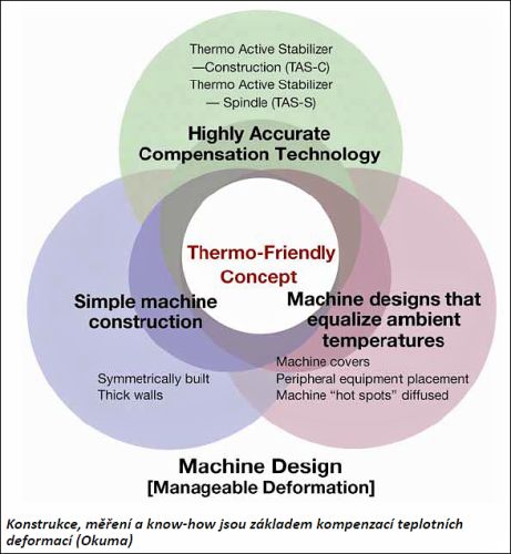 Teplo, teplota, tepelná vodivost, měrná tepelná kapacita, koeficient teplotní objemové roztažnosti slouží k popisu fyzikálního jevu, kterému se v tomto díle seriálu o obráběcích strojích věnujeme – jde o teplotní roztažnost. Technické objekty se s tímto pro ně palčivým jevem vypořádávají „jak je v daném oboru zvykem“. Na mostech nalezneme dilatační spáry, teplovodní potrubí jsou vybavována osovými kompenzátory typu „U“, vlnovcovými atd. V těchto případech je objekt navržen tak, aby v rozsahu provozních teplot zaručeně plnil svou funkci s tím, že v průběhu provozu se aktuální délka např. zmíněného potrubí nesleduje. Existují však obory, kde je pro zaručení správné funkce nutné znát v každém okamžiku změny rozměrů díla vlivem změny teploty objektu, popř. okolí. Příkladem jsou turbíny, medicínská technika a týká se to i těch obráběcích strojů, u kterých je snaha dosáhnout nadstandardních parametrů – vysoké výrobní přesnosti. V oboru obráběcích strojů jsou teplotní deformace sledovány zejména ve vztahu nástroj-obrobek. A protože mezi nimi se nachází nosná struktura – rám stroje, jsou právě rámy a jejich teplotní deformace velmi sledovanou součástí stroje. Rostoucí požadavky na přesnost výroby zvyšují intenzitu výzkumu a vývoje této oblasti konstrukce a provozu strojů. Zejména u vysokorychlostního obrábění, kdy se vysoké produktivity dosahuje rychlostním, nikoli silovým principem, jsou deformace vlivem ohřívání a ochlazování rámu a dalších částí stroje vyšší než vlivem sil, vznikajících při řezném procesu. Základní pro minimalizaci teplotních deformací jsou některé konstrukční principy a konstrukční uspořádání (řešení), jež uvádíme dále.