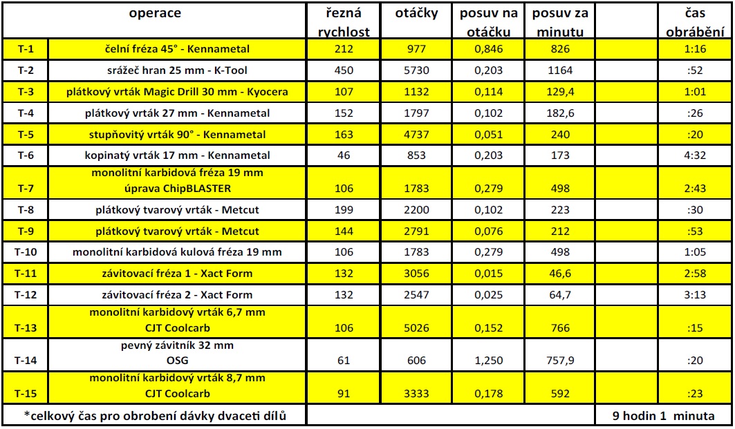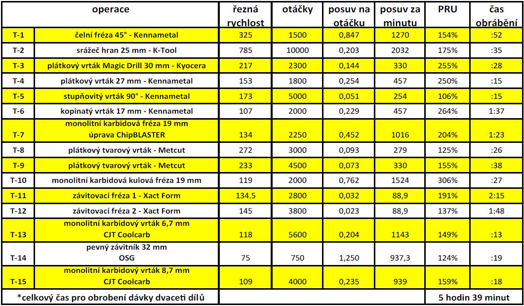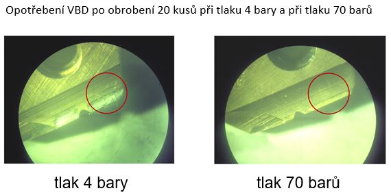 Stále více firem si uvědomuje výhody vysokotlakého chlazení středem nástroje. Přesně fokusovaná chladicí kapalina Vám při obrábění zajistí kontrolu nad teplotou v místě řezu a také kontrolu nad odvodem třísek z místa řezu. Vysoký tlak láme třísku mnohem lépe a také odvádí špony z místa řezu, tím nedochází k jejich znovuobrábění a poškození nástroje, obrobku a potažmo i stroje. Výhody vysokotlakého chlazení jsou nejvíce patrné při vrtání hlubokých děr. Některé aplikace jsou dnes bez středového chlazení nepředstavitelné. Vysoký tlak umožní mnohem vyšší řezné rychlosti a výrazně prodlouží životnost nástrojů. Například u monolitních karbidových vrtáků se může životnost prodloužit až 10krát. Pokud Vašim cílem není šetřit nástroje, můžete za pomoci vysokého tlaku obrábět mnohem rychleji bez vlivu na trvanlivost nástrojů. Firma ChipBLASTER, světová jednička ve vývoji a výrobě vysokotlakého a velkoobjemového chlazení pro obráběcí stroje, prováděla test při obrábění dílu hydraulického rozdělovače přímo pro své vysokotlaké chladicí jednotky. Dávka dvaceti kusů tohoto dílu byla při použití nízkého tlaku (4 bary) obrobena za více než 9 hodin. Při tlaku 70 barů a maximálních řezných rychlostech nástrojů může být obrobena už za 4 hodiny. Nejefektivnější je ovšem najít kompromis mezi zvýšením řezných rychlostí a nárůstem životnosti nástrojů. Z tabulek vyplývá, že při takovémto procesu se úběr materiál zvýšil o více než 80 %. Celkový nárůst produktivity pak činil více než 60 %, celkový čas obrábění se u dávky dvaceti dílů snížil z devíti hodin na 5 hodin a 39 minut, při zvýšení životnosti nástrojů (viz obrázky).