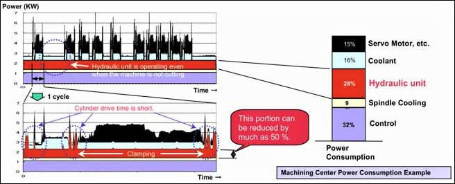 Posuzovaly se dva typy obráběcích strojů, frézovací centra soustružnická centra 5 výrobců, celkem bylo posuzováno 9 strojů. Jejich výsledkem jsou závěry, že provoz se drtivě podílí na spotřebě energií. Na přiloženém obrázku (obr. 3, zdroj CECIMO) je odhad snižování energetické náročnosti oboru obráběcích strojů s nástupem moderních ekologicky šetrných koncepcí. Na posledním obrázku (obr. 4, zdroj Daikin) je zachycen průběh zatížení agregátu firmy Daikin, který následně slouží k optimalizaci jeho řízení z hlediska spotřeby elektrické energie. Příkladem v oblasti obráběcích center je konstruktérský úspěch nejen v oblasti snižování energetické náročnosti firmy GROB. Ta vyvinula obráběcí centrum, které neobsahuje hydraulicky řízené funkce, obvody, agregát atd., jež standardně slouží například k upínání nástrojů (upnutí nástroje je mechanické, uvolnění hydraulické). Hydraulické obvody obvykle vykonávají činnosti a plní funkce, kde je potřeba velkých akčních sil, avšak zároveň jsou spojeny s vysokými ztrátami. Jedná se o řešení stroje, jak výrobce vyzdvihuje, které je spolehlivější, funkčně rychlejší, ekologičtější. Jde o unikátní řešení výrobního zařízení založené zejména na konstrukci zejména vřetene a upínání nástrojů, které je elektro-mechanické.