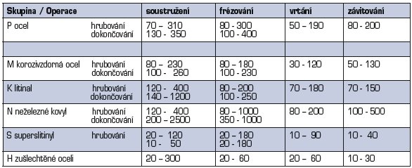 Zde uvedené rychlosti (vc uvedené v m/min) slouží pouze pro ilustraci možností moderních řezných materiálů; konkrétní volba musí brát ohled na konkrétní řezný materiál, řezné podmínky (posuv, hloubku řezu a geometrii nástroje), detailní specifikaci obráběného materiálu (obrobitelnost, typ obráběcí operace - např. přerušovaný řez, hrubování či dokončování, priorita životnost versus produktivita), na charakteristiku obrobku a stroje atd. a je účelné řezné podmínky konzultovat s dodavatelem vybraného řezného nářadí.