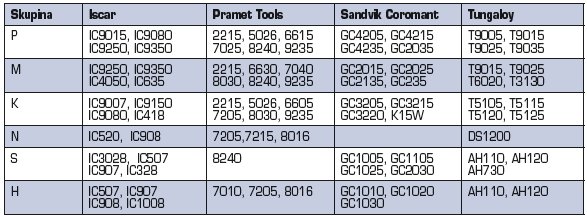 V nabídce renomovaných výrobců jsou desítky řezných materiálů, nabízených pod nejrůznějšími obchodními názvy. Jejich vzájemné porovnání je obtížné, protože jednotlivé typy se z hlediska určení navzájem plně nekryjí. Pro zjednodušení obsahuje uvedené porovnání pouze několik výrobců a jen CVD a PVD řezné materiály.