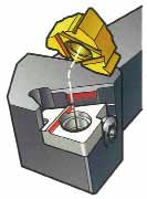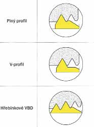 je nejproduktivnější metodou výroby závitů vnějších i vnitřních; lze ji použít pro většinu profilů závitu, dosahuje se jí dobrá kvalita obrobeného povrchu a při použití vhodného držáku lze zhotovovat závity i ve značné hloubce otvoru. Volbou parametrů řezného procesu a geometrie řezné destičky je možno dosáhnout potřebného utváření vznikajících třísek a tím usnadnit jejich odstranění z místa řezu. Tvar profilu je dán tvarem břitové destičky; její sklon musí odpovídat úhlu stoupání šroubovice závitu, který je dán roztečným průměrem závitu a jeho stoupáním; průměr závitu a jeho stoupání jsou určeny obráběcím strojem. Pro zhotovení profilu závitu lze užít tři typy břitových destiček: s plným profilem, s V-profilem a hřebínkové destičky (obr. 2). Destičky s plným profilem vytvářejí kompletní tvar závitu včetně vrcholu a jsou první volbou pro produktivní výrobu závitů s vysokou kvalitou tvaru. Pro každé stoupání a profil závitu je nutné použít jinou VBD; protože se opracovává i vrchol závitu, je zapotřebí zvláštní přídavek 0,03 – 0,07 mm na poloměru polotovaru a zpravidla není nutno odstraňovat otřepy. Destičky s V–profilem neseřezávají vrchol závitu, proto se musí opracovat polotovar na správný rozměr. Stejnou destičku lze použít pro určitý rozsah stoupání a stejný úhel profilu závitu; má tedy univerzální charakter. Hřebínkové destičky mají více než jeden hrot a jsou proto produktivnější – větší kontaktní délka řezné hrany však způsobuje větší řezné síly.