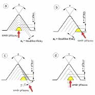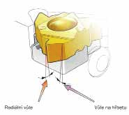 Přesnost tvaru závitu a životnost VBD jsou podmíněny dvěma typy úhlových vůlí: radiální vůlí a vůlí na hřbetu (obr. 3). Úhel nastavení pro potřebnou velikost radiální vůle činí pro vnější obrábění cca 10°, pro vnitřní 15° a je při správném výškovém nastavení destičky do osy dán nástrojovým držákem. Správný úhel sklonu by měl být stejný jako úhel stoupání šroubovice; zajišťuje totiž stejnou pracovní vůli mezi hřbety VBD a oběma boky závitu a tím i rovnoměrné opotřebení VBD.