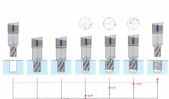 Dosahuje se použitím tvarové vymezovací destičky pod VBD. Obecně platí, že čím menší je úhel profilu závitu, tím menší je i vůle na hřbetu a tím větší důležitost má správná volba podložky. Velikost přísuvu a počet záběrů (průchodů nástroje) jsou odvislé od stoupání závitu; v praxi se používají doporučení výrobce nástroje, většinou ve formě tabulek. Pro úběr celého profilu závitu lze použít různé metody přísuvu (obr. 4). Radiální přísuv (a) se používá nejčastěji, vytváří však tvrdou třísku tvaru V a zvyšuje tepelné namáhání špičky VBD. Je proto vhodný pro závity s jemným stoupáním. Boční přísuv (b, c) snižuje tepelné namáhání špičky a tím i její opotřebení, umožňuje lepší tvar i odvod třísky. Nevýhodné vysoké tření na pravém bočním břitu lze eliminovat užitím bočního přísuvu s odklonem 3 – 5°. Střídavý přísuv (d) se doporučuje pro velká stoupání závitu a pro materiály tvořící dlouhou, obtížně utvářitelnou třísku. Výhodou je rovnoměrnější opotřebení boků VBD. Nástrojové držáky pro soustružení závitů musí zajistit přesné a dostatečně stabilní a tuhé uložení břitové destičky, odolné proti vymačkání. Příkladem je řešení iLock od firmy Sandvik Coromant využívající vodicí lišty na VBD i na vymezovací destičce (obr. 5). Vlastní provedení nástroje pak může být s prizmatickou stopkou pro upnutí do suportu nebo revolverové hlavy, v podobě vyvrtávací tyče pro zhotovování vnitřních závitů nebo jako výměnná hlavice, použitelná v modulární nástrojové soustavě. Řezné parametry pro soustružení závitů jsou dány typem a velikostí závitu, materiálem a jakostí použité břitové destičky; je proto výhodné, spolehnout se na doporučení výrobce nástroje a řezné destičky. FRÉZOVÁNÍ ZÁVITŮ je metoda, která se stále více prosazuje a v řadě případů úspěšně nahrazuje používání závitníků. Provádí se pomocí rotačního nástroje (závitové frézy), pohybujícího se po sestupné kruhové dráze (obr. 6), a je proto podmíněna strojem, schopným provádět současné pohyby v osách X, Y a Z. Pohyb v osách X a Y určuje průměr závitu, pohybem v ose Z je dána rozteč. V nabídce jsou jednohroté i vícehroté závitovací frézy (např. Emuge Franken GF a GSF, Sandvik Coromant CoroMill Plura, CoroMill 327 a 328 a další). Frézování závitů je vhodné ke zhotovování závitů v nerotačních nebo tenkostěnných součástech, v rohu součásti apod. Protože se jedná o přerušovaný řez, využije se s výhodou k opracování materiálů, kde je obtížné dělení třísek, v hloubce otvoru, při obrábění houževnatých materiálů, kde jsou velké řezné síly, a všude tam, kde by mohly být velké problémy s odstraněním zlomeného závitníku. K dalším přednostem patří, že jednu závitovou frézu lze použít pro různé průměry závitu, stejná VBD je vhodná pro pravé i levé závity, pro různé rozteče lze použít tutéž frézu s jednohrotým břitem, a proto se snižuje potřeba nástrojového inventáře. Frézu lze opatřit srážecí fazetkou pro sražení hrany závitového otvoru, závit lze zhotovit až do dna slepého otvoru, závitové frézy nevyžadují užití řezné kapaliny – naopak, její užití zvyšuje nebezpečí vzniku tepelných trhlin. Při frézování závitu vzniká nepodstatná odchylka tvaru profilu závitu u jeho dna. Z toho důvodu se doporučuje, aby průměr frézy nebyl větší než 70 % průměru zhotovovaného závitu. Programování musí zajistit pozvolný a plynulý nájezd a výjezd nástroje ze záběru a programování s korekcí na poloměr umožňuje jednoduše upravit tolerance závitu. Je vhodné volit velmi malé hodnoty posuvu na zub a vždy je výhodnější použít sousledné frézování. Proto např. při výrobě pravých vnitřních závitů se volí počáteční poloha frézy co nejblíže dna otvoru a následně se fréza pohybuje proti směru hodinových ručiček a směrem z otvoru ven. Řezné podmínky je opět záhodno ponechat na doporučení dodavatele nástroje.