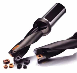 NÁSTROJE OSAZENÉ VYMĚNITELNÝMI BŘITOVÝMI DESTIČKAMI se používají pro obrábění děr vyšších průměrů – dodávají se v rozsahu 12 – 80 mm. Proti přesně broušeným šroubovitým vrtákům jsou méně přesné a běžně nemohou zhotovovat tak hluboké otvory; vyznačují se však vyšší produktivitou. Průměr mají pokryt asymetricky uspořádanými břity, navzájem se překrývajícími a použité břitové destičky mohou být upnuty přímo do tělesa vrtáku nebo se u větších průměrů používá upínacích kazet pro jednu či dvě destičky. Odpadá nejen nutnost nákladného přeostřování, ale je možno volbou vhodných destiček středových i obvodových optimalizovat řezný materiál i geometrii vůči rozdílným podmínkám v ose nástroje i na jeho obvodu. Protože se sčítají tolerance destiček i lůžka je nevýhodou tolerance otvoru, dosažitelná v hodnotách IT 12 – 13. Vrtáky s vyměnitelnými břitovými destičkami (obr. 3), použité na moderních obráběcích strojích s vhodným řídicím systémem, dovolují aplikace nejen konvenčního vrtání, ale i vyvrtávání, zhotovování osazení, vnoření do silně skloněného povrchu, užití šroubovicové interpolace pro zhotovení otvorů větších než je průměr vrtáku apod. Dochází tak k překračování hranic mezi vrtáky a stopkovými frézami (Pramet 8xxx, Sandvik CoroDrill 881, Sumitomo WDX, Tungaloy TDX, Iscar SumoDrill, multifunkční Iscar DR-MF a další).