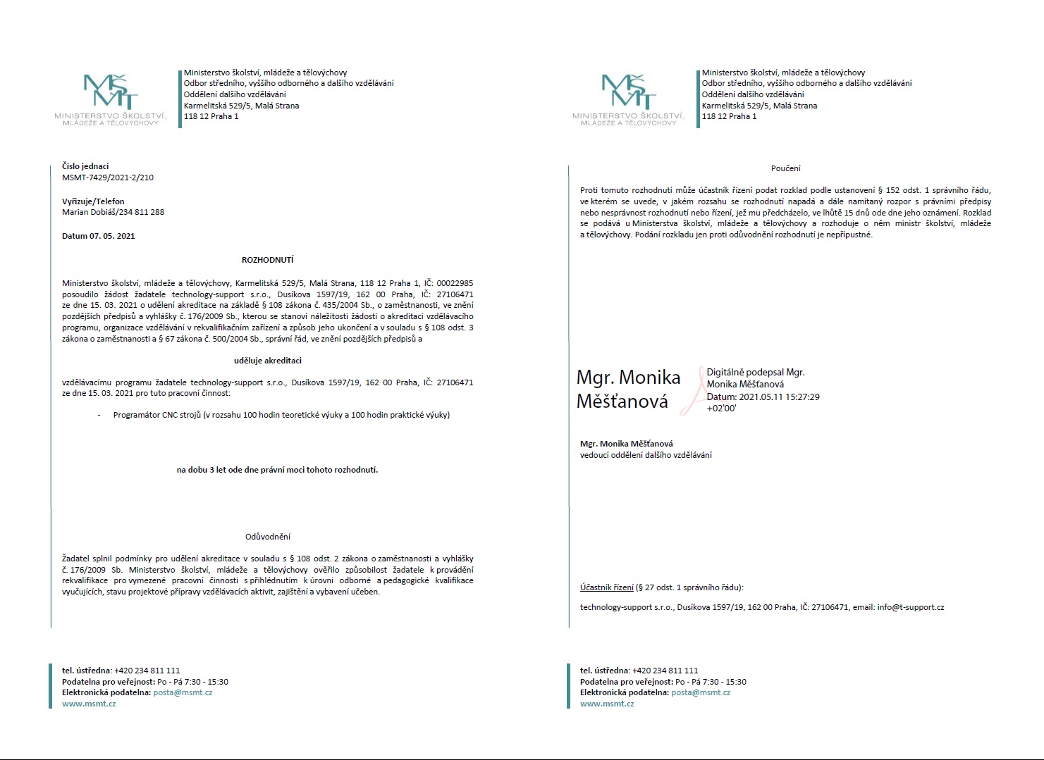 Dne 7. 5. 2021 prodlužuje Ministerstvo školství, mládeže a tělovýchovy akreditaci vzdělávacímu programu žadatele technology-support s.r.o. pro tuto pracovní činnost: Programátor CNC strojů.
