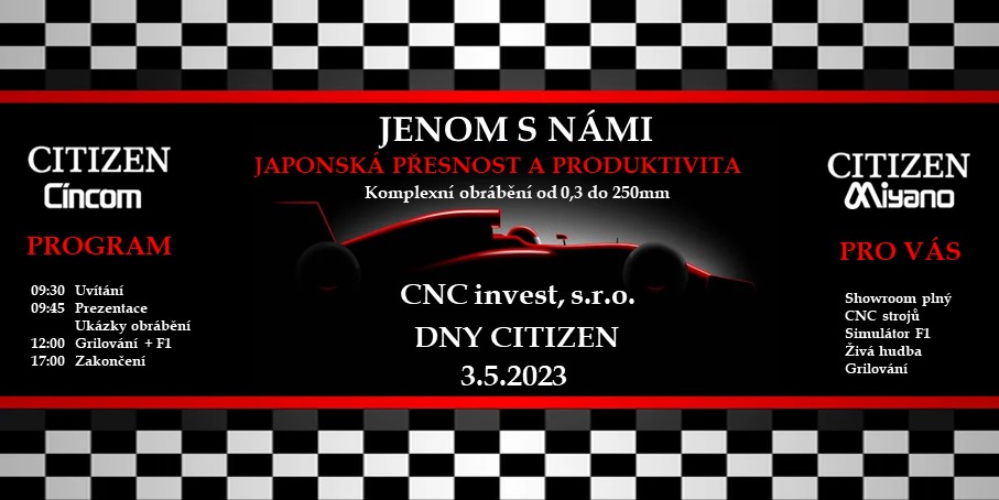 Dny CITIZEN CINCOM a MIYANO3. 5. 2023, CNC invest, s.r.o. Srdečně vás zveme na akci "Dny CITIZEN CINCOM a MIYANO", které se budou konat dne 3. 5. 2023 v showroomu společnosti CNC invest, s.r.o.
