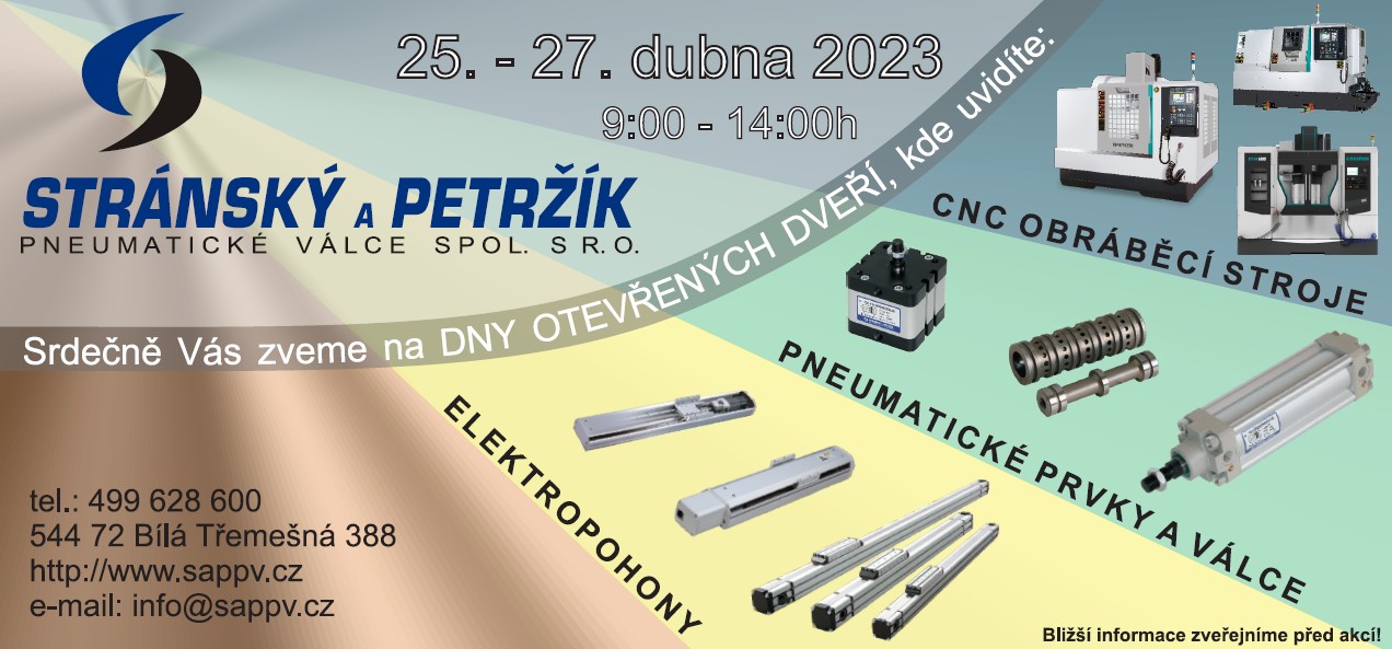 dny otevřených dveří ve firmě Stránský a Petržík, Pneumatické válce spol. s r.o. 202325. – 27. 4. 2023, Bílá Třemešná Zveme vás na dny otevřených dveří ve firmě Stránský a Petržík, Pneumatické válce spol. s r.o., které se budou konat od 25. do 27. dubna 2023, vždy od 9:00 do 14:00 hodin v areálu společnosti na adrese Bílá Třemešná 388, 544 72.