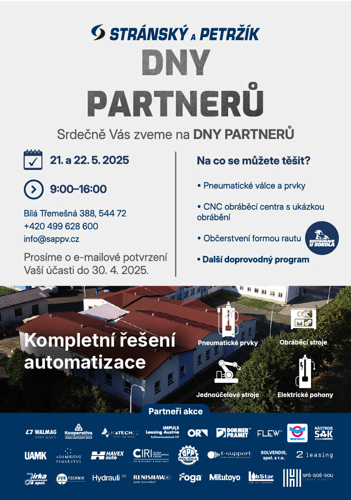 dny partnerů ve firmě Stránský a Petržík, Pneumatické válce spol. s r.o. 202521. – 22. 5. 2025, Bílá Třemešná DNY PARTNERŮ SAP, které se konají v areálu firmy Stránský a Petržík v Bílé Třemešné u Dvora Králové nad Labem ve dnech 21. a 22. května 2025 vždy od 9:00 do 16:00 hodin. Program: Představení sortimentu pneumatických prvků, nových výrobků a doplňujícího sortimentu společnosti Stránský a Petržík, včetně možnosti prohlídky výrobních prostor. Ukázka obráběcích strojů COSMOS a FEELER, novinky a servisní zázemí.