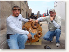 | Brandon Fisher, zakladatel a ředitel Center Rock (vlevo), Richard Sopp, manažer projektu, a jejich 64 cm vrtná tyč, která v hloubce 630 m vyvrtala poslední zbytky země mezi horníky a jejich svobodou. |