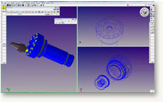 | Na obrázku je simulace obrábění rozdělena do tří oken, ve kterých jsou dráhy nástroje při obrábění. |