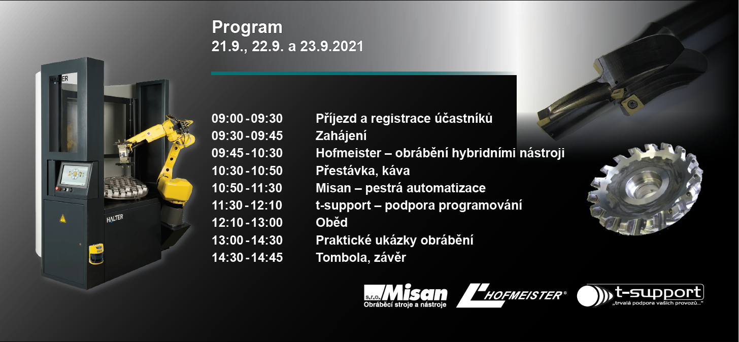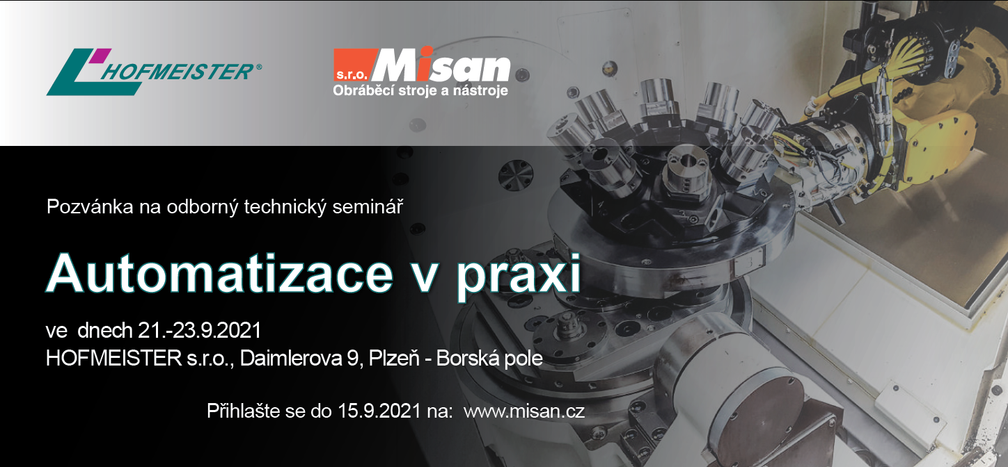 Hofmeister & Misan & t-support – automatizace v praxi21. – 23. 9. 2021, Plzeň Dovolujeme si vás pozvat na odborně technický seminář "Automatizace v praxi" pořádaný firmami Hofmeister & Misan & t-support ve dnech 21. - 23. 9. 2021 ve výrobních prostorách plzeňské firmy HOFMEISTER s.r.o., Daimlerova 9, Plzeň - Borská pole.