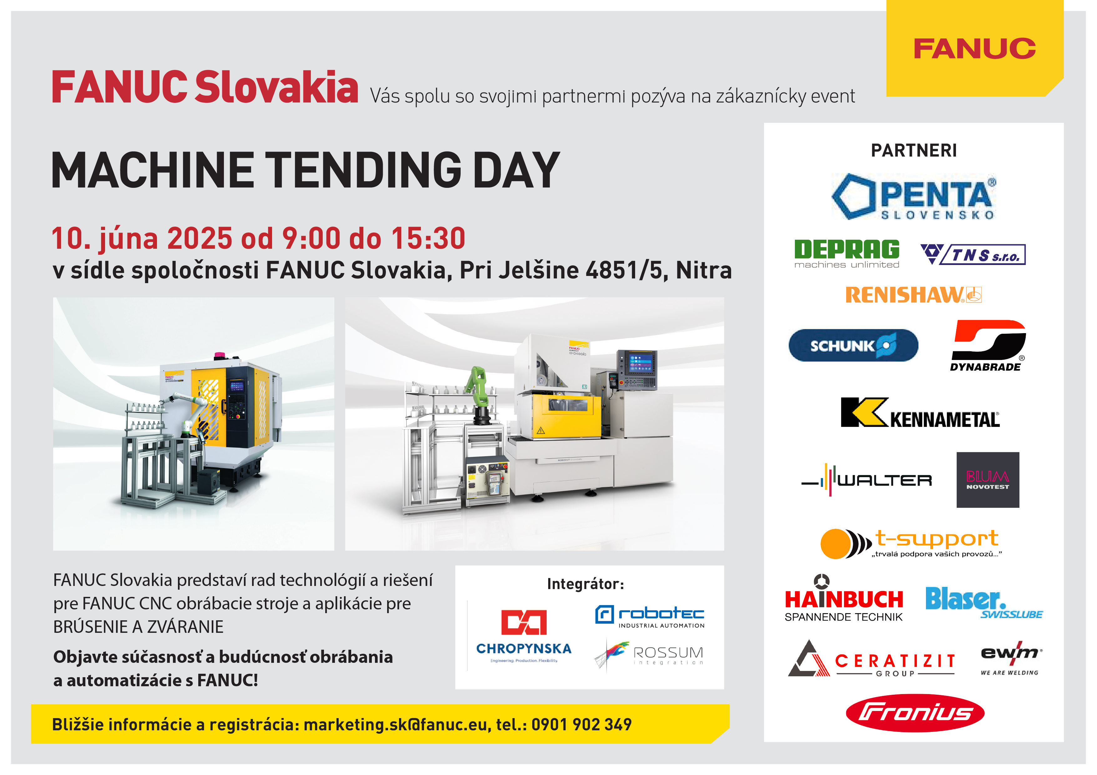 Rádi bychom vás jménem společnosti t-support pozvali na zákaznický den MACHINE TENDING DAY, který pořádá společnost FANUC Slovakia společně se svými partnery.