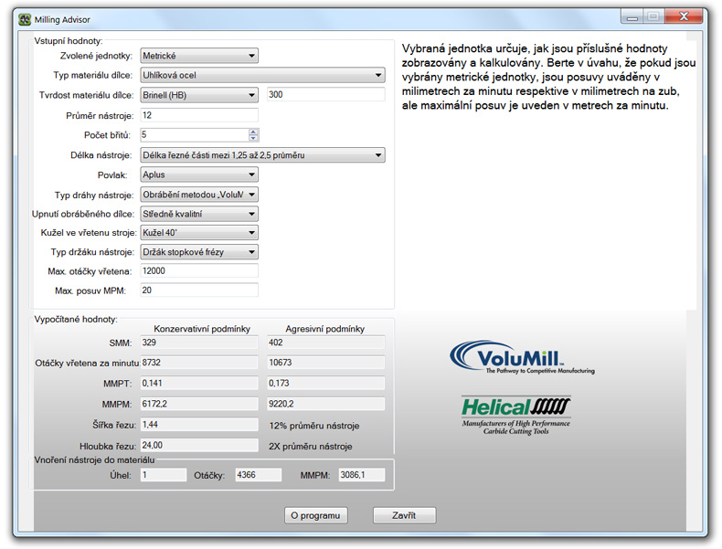 Volumill Poradce pro frézování, MillingAdvisor lze stáhnout v sekci ... a něco navíc.