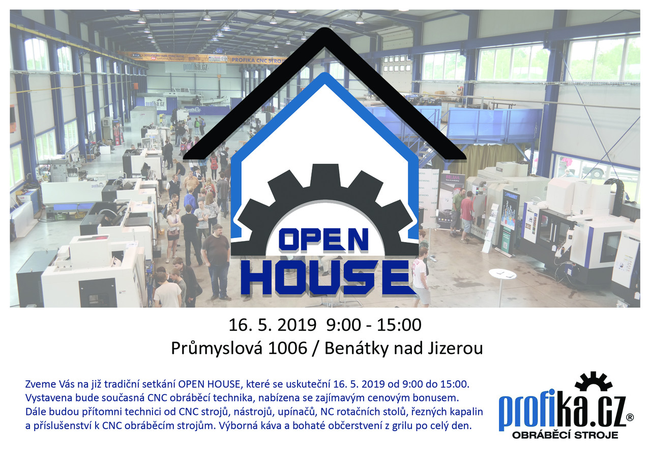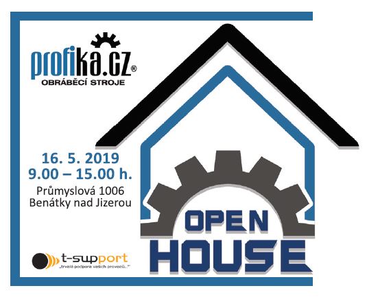 PROFIKA Open House 201916. 5. 2019 v Benátkách nad Jizerou Zveme Vás na již tradiční setkání OPEN HOUSE, které se uskuteční 16. 5. 2019 od 9:00 do 15:00 hod.. Vystavena bude současná CNC obráběcí technika, nabízena se zajímavým cenovým bonusem. Dále budou přítomni technici od CNC strojů, nástrojů, upínačů, NC rotačních stolů, řezných kapalin a příslušenství k CNC obráběcím strojům. Výborná káva a bohaté občerstvení z grilu po celý den. Předem prosím potvrďte svou účast prostřednictvím "Kontaktního formuláře" na stránkách zde. Těšíme se na Vaši návštěvu i se zástupci partnerských firem včetně technology-support.