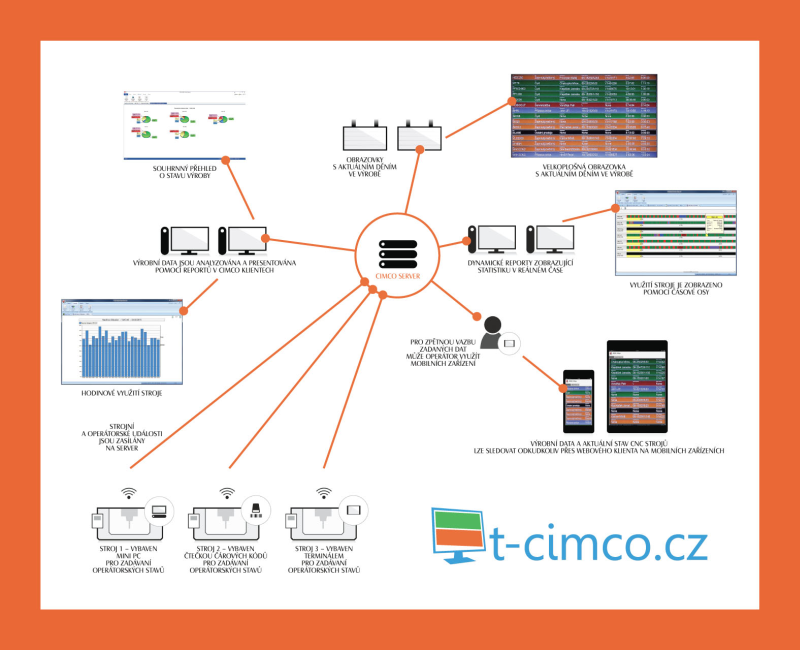 aktuální výrobní informace, DNC přenos, editace NC programu, monitoring výroby, náklady na zakázku, správa, verzování a zálohování NC programu, OEE, správa výrobní dokumentace, vyhodnocování efektivity CNC stroju, návratnost investic, bezvýkresová dokumentace, on-line přehled, RS232, WiFi, LAN ...