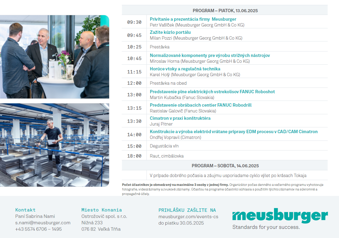 Návštěvníky akce určené nejen pro zákazníky firmy Meusburger, ale pro všechny, koho zajímají novinky z oblasti výroby v nástrojárnách, čeká bohatý program a možnost navázaní kontaktů s firmami ze Slovenska i Čech.