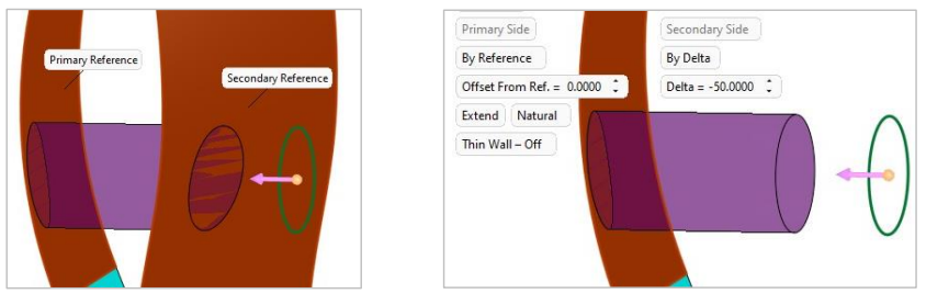 VysunutíVysunutí nyní umožňuje vysouvat kontury na obě strany. Obě strany mohou být definovány jako reference. Obě reference mohou být ve stejném směru vůči kontuře.