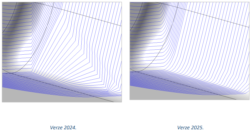 Procedura ČištěníV této proceduře byla za prvé vylepšena kvalita obrábění vnitřních hran a rohů. Za druhé nově umí procedury čištění rohů obrábět pod úroveň spodní plochy pomocí kulových nástrojů. Bod dotyku kulového nástroje tedy „dojede“ až na spodní hranu rohu. Tím je zamezeno zanechání zbytkového materiálu na konci svislých rohů.