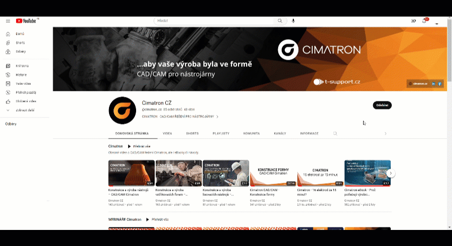 Proč odebírat YouTube kanál Cimatron CZ? Neunikne vám žádné video, které zde zveřejníme. Najdete tu ✅ OBECNÁ VIDEA o CAD/CAM řešení Cimatron, ale i e-booky nebo některé ukázky. ✅ WEBINÁŘE – pokud vás minul některý z našich webinářů, jsou ke zhlédnutí právě zde. ✅ TUTORIÁLY – výuková videa Cimatronu vám představí postupy práce s tímto softwarem v jednotlivých oblastech. ✅ UKÁZKY – ukázky práce se Cimatronem například při tvorbě forem, elektrod apod. ✅ POSTŘEHY – krátké videotipy s radami a nápady pro uživatele Cimatronu. ✅ PREZENTACE – videa z powerpointových prezentací k Cimatronu na různá témata. ✅ SHORTS – videa „do minuty“ představující funkce v Cimatronu, o kterých byste měli vědět.