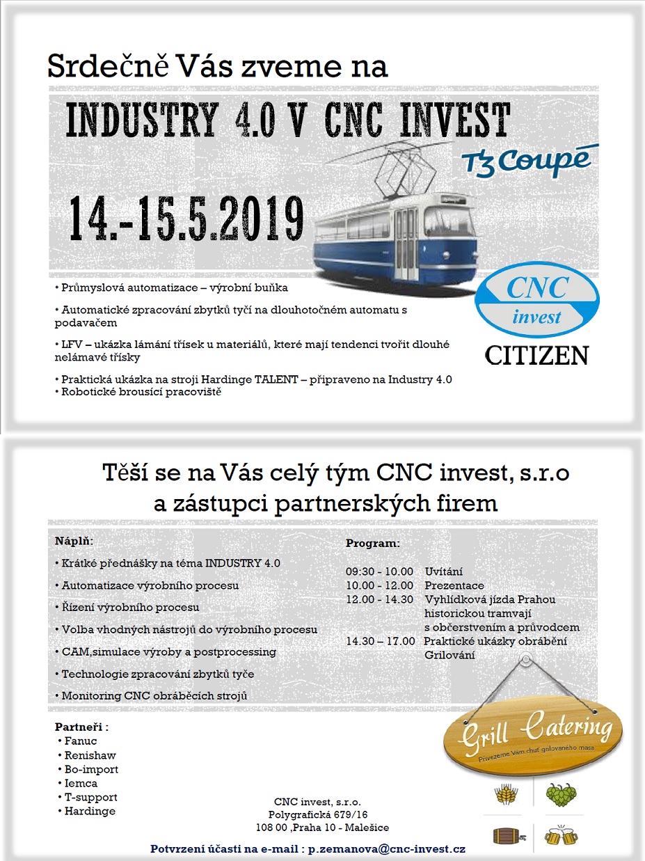 Prosíme o potvrzení účasti na e-mail: p.zemanova@cnc-invest.cz Těší se na Vás celý tým CNC invest, s.r.o a zástupci partnerských firem včetně technology-support. Více informací ZDE.